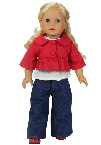 Low Price 18 Inch Doll Jacket 3 Piece Set fits American Girl Dolls - Includes Red Button Jacket, Doll Denim Jeans & Blouse